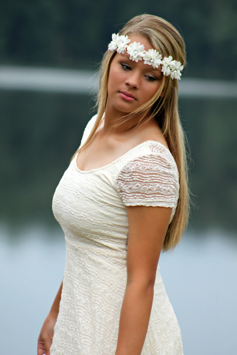 Девушка в белом платье и цветочным венком на голове из белых цветов на фоне озера