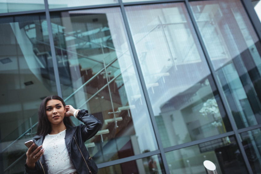 Девушка в кожаной куртке на фоне офисного здания
