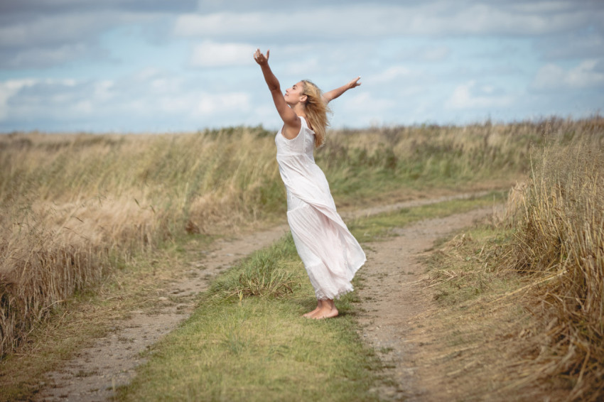 Девушка блондинка в белом платье с распростёртыми руками в поле на лесной дороге в профиль