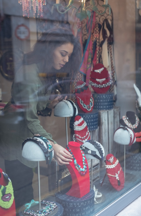 Продавец оформляет витрину магазина