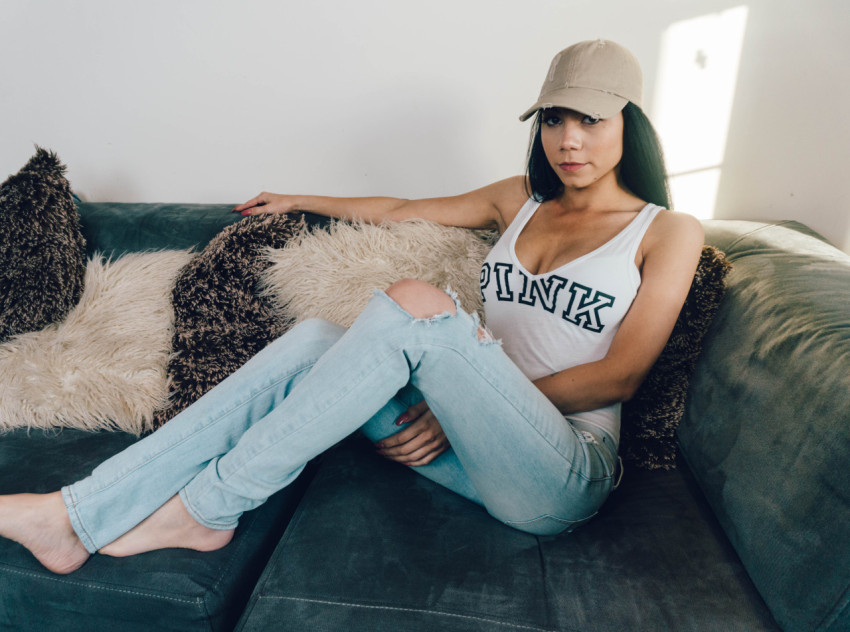 Девушка дома на диване в рваных джинсах и кепке