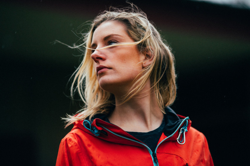 Девушка спиной сидит на скамейке на высокой смотровой площадке и любуется городом на закате