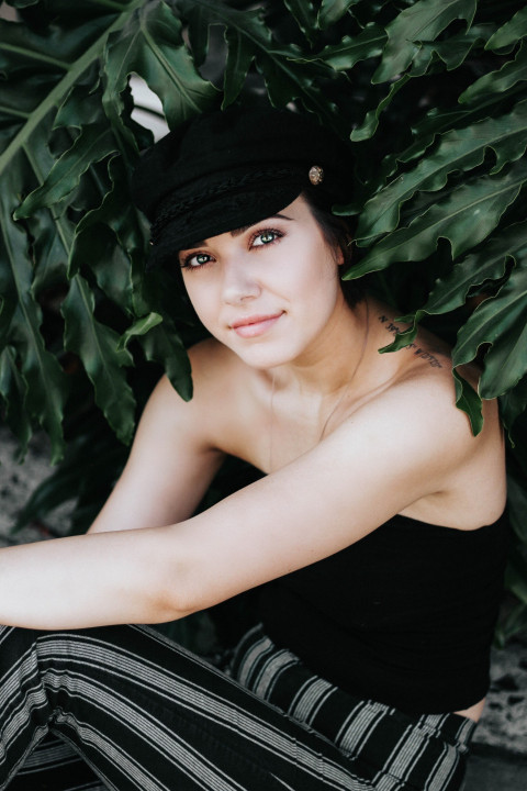 Девушка в белом платице сидит возле дороги в огнях ночной улицы