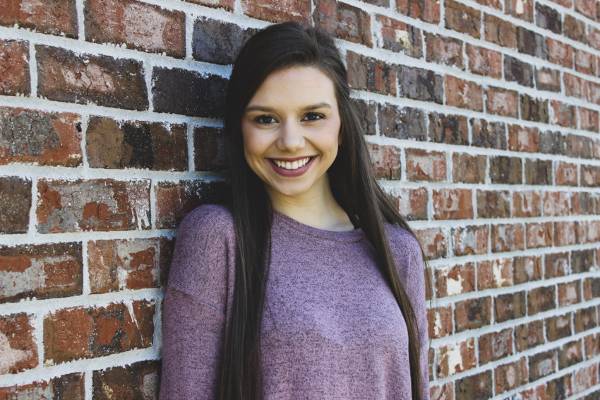 Красивая девушка улыбается прислонившись к кирпичной стене