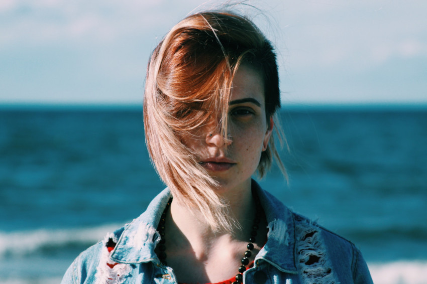 Девушка блондинка спиной раскинув руки в стороны на природе в поле на холме