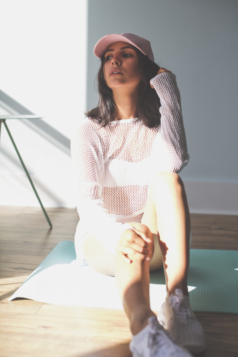 Девушка в кепке и кроссовках сидит на полу на коврике для йоги