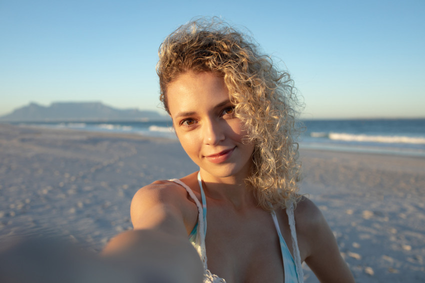 Девушка в закрытом белом купальнике на пляже сыпет песок