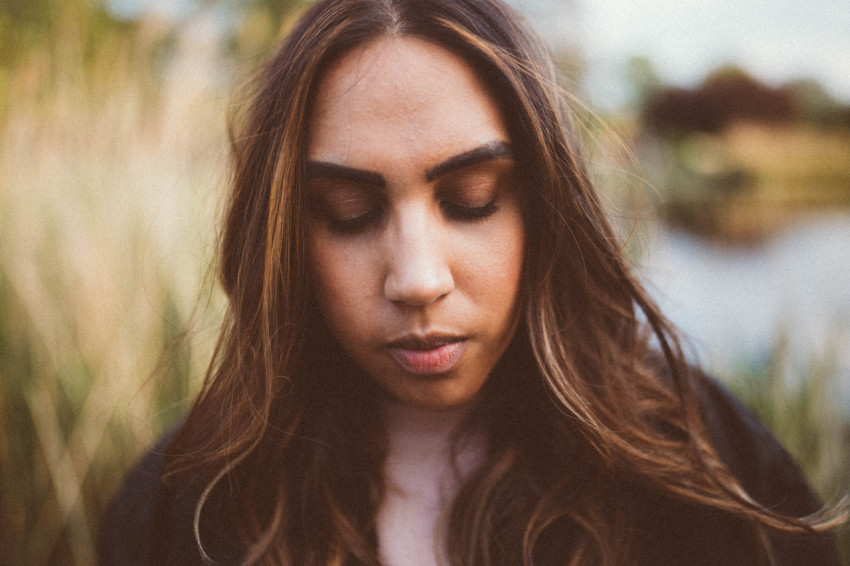 Девушка спиной с поднятыми вверх руками сложила ладони в форме сердца