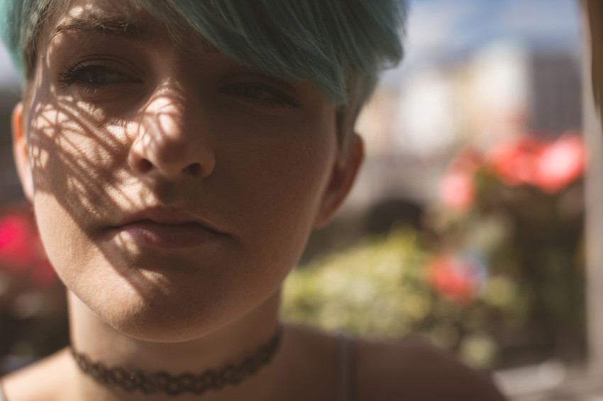 Девушка спиной в зимнем лесу в горах под хлопьями снега