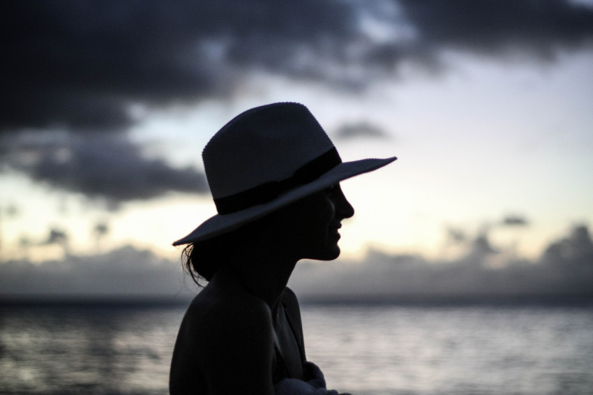 Девушка в позе из йоги в купальнике на мостике у пляжа