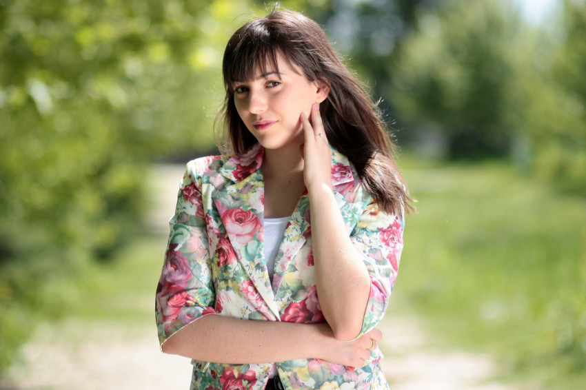 Девушка красивая в летнем пиджаке в цветочек
