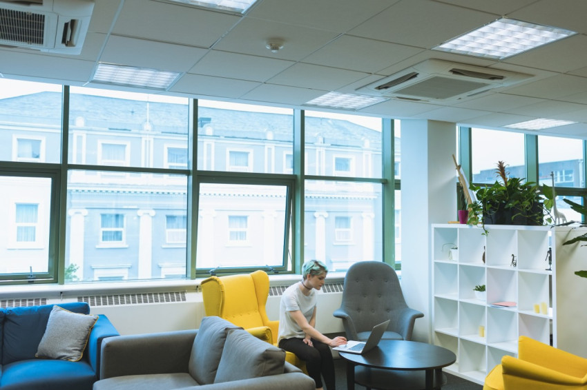 Девушка за ноутбуком в зоне отдыха офиса