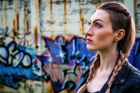 Девушка брюнетка в синем платье на фоне деревяннойц стены фотосессия