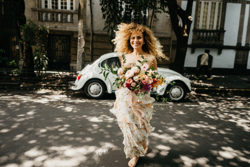 Девушка с букетом цветов идет по улице