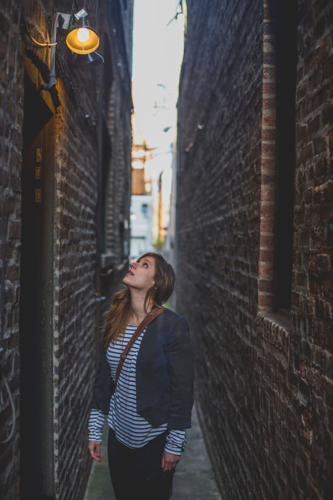 Девушка идет по узкой улочке и смотрит на горящий уличный фонарь