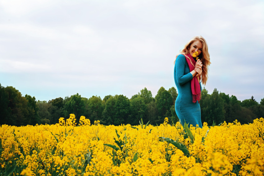 Летняя фотосессия девушки в платье в цветочек на природе в траве улыбается