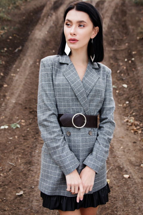 Девушка в коротком платье и меховом жилете на балконе смотрит вниз
