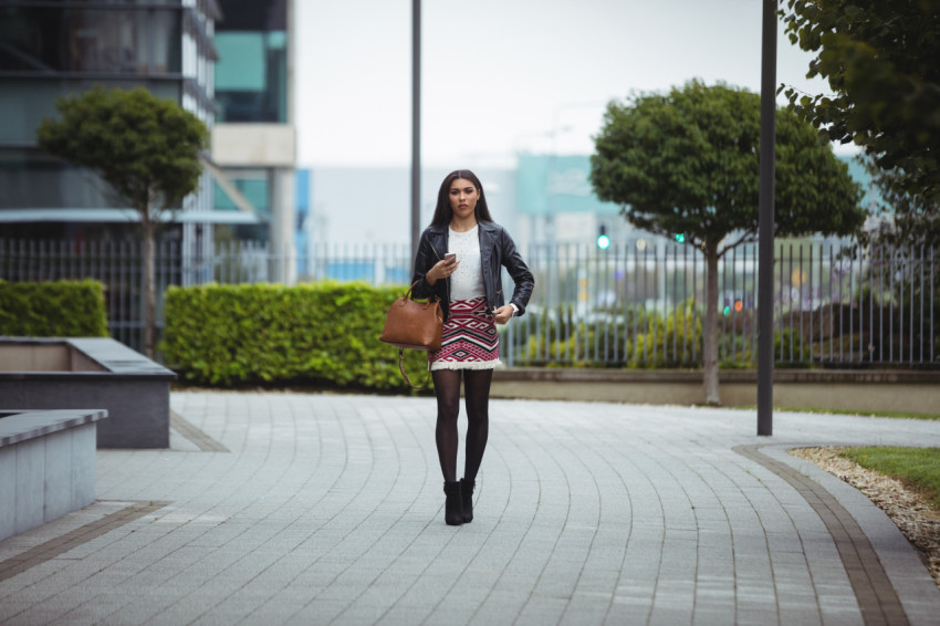 Девушка в юбке, с коричневой сумкой и кожанке идет по улице