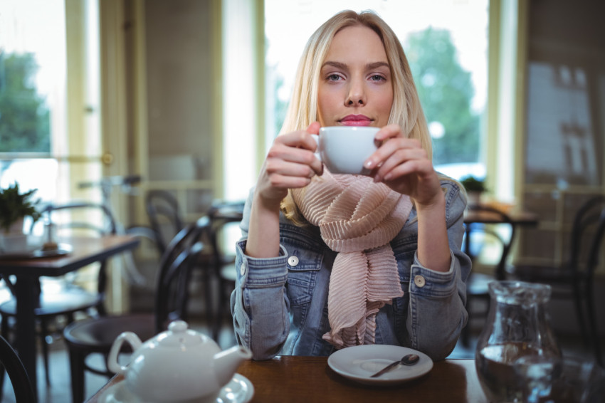 Девушка пьет чай в кафе