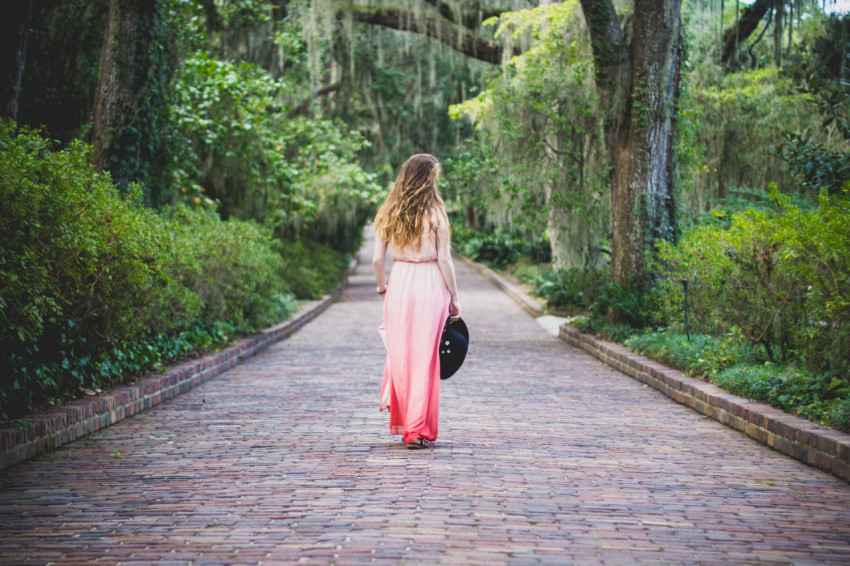 Девушка в длинном платье гуляет в парке