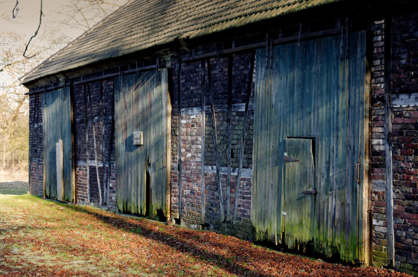 Старый кирпичный сарай с деревянными воротами