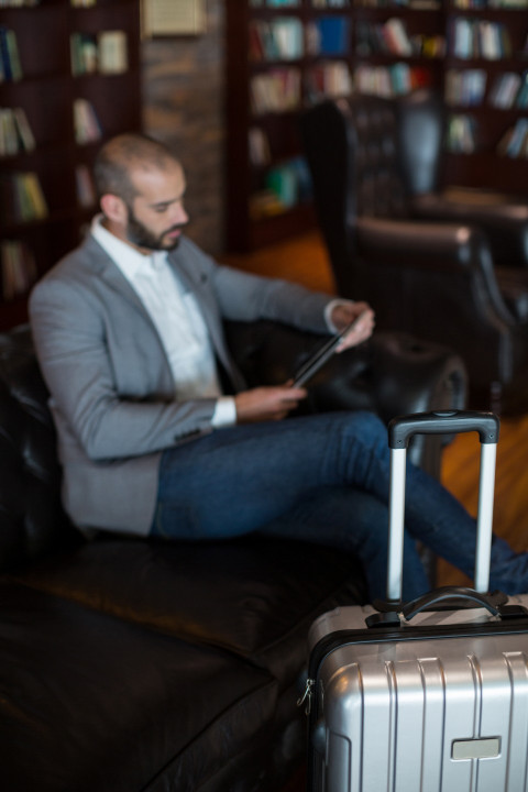 Бизнесмен с планшетом и смартфоном в руках на фоне офисного здания