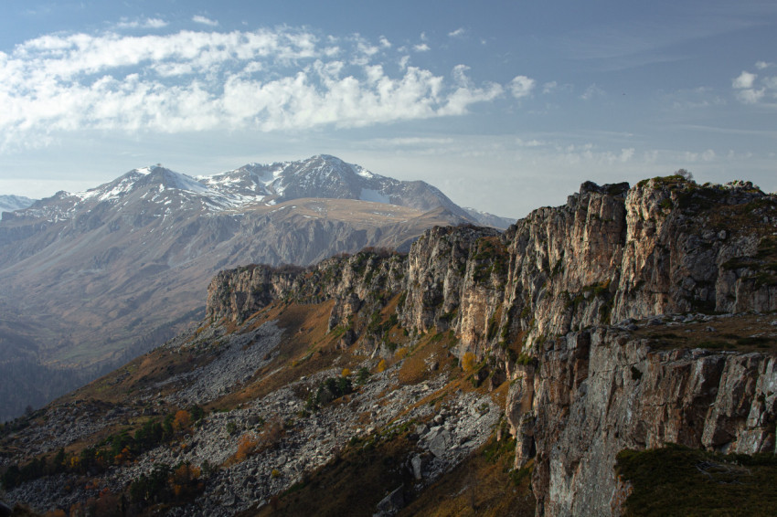 Утренняя дымка в горах. Горы и величественные ели. Алтай.