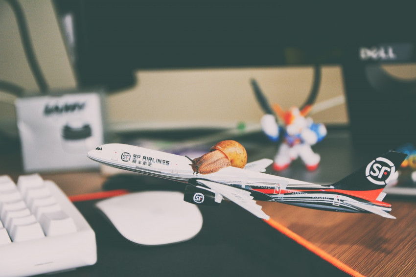 Улитка на макете самолета на рабочем столе