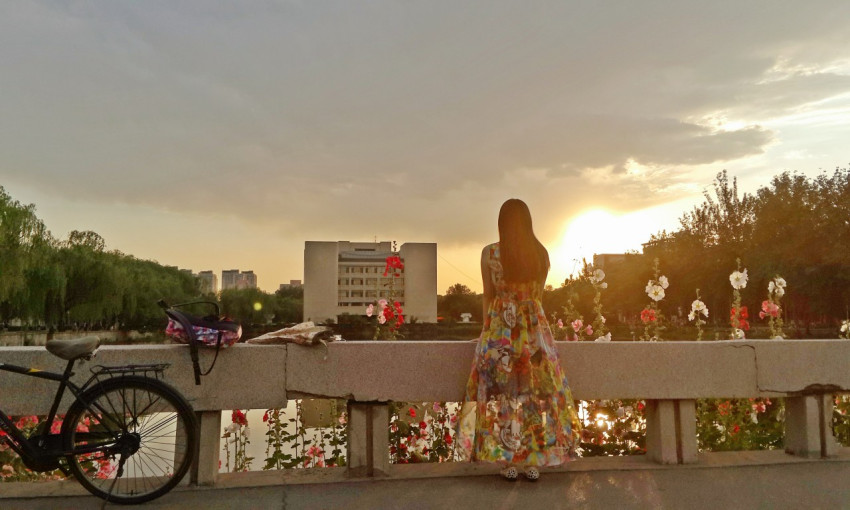 Девушка спиной на закате смотри вдаль на противоположный берег озера