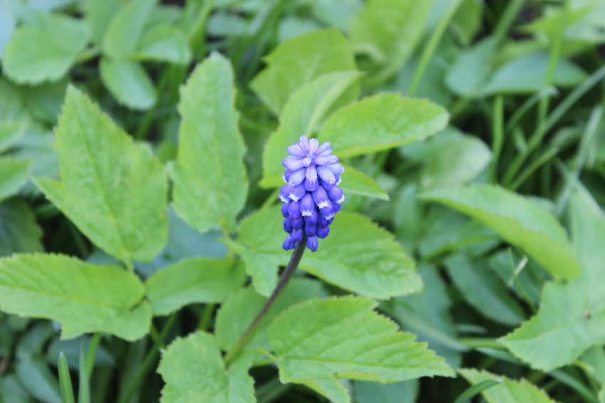 Синий цветок гиацинта на размытом фоне зелёной травы